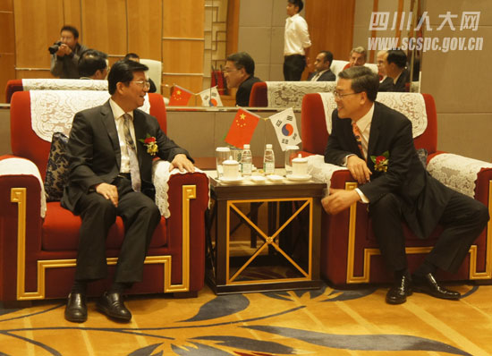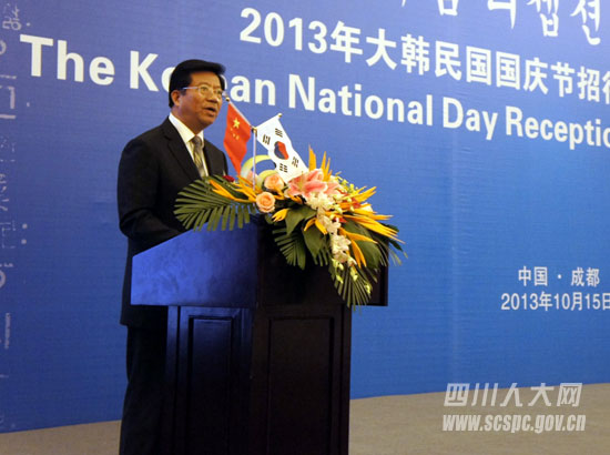 10月15日,由韩国驻成都总领事馆主办的“2013年大韩民国国庆招待会暨传统美食节”在成都举行,省人大常委会副主任彭渝出席招待会,向领馆和所有在川的韩国朋友表示祝贺。他在致辞中说,四川与韩国在经济、科技、文化、教育、旅游等领域的交流与合作日益密切,贸易增长较快。韩国已成为四川重要的贸易伙伴和投资来源地,并对领馆积极支持和帮助我省抗震救灾和恢复重建工作表示赞赏和感谢。省人大外事侨务委员会主任委员秦琳陪同出席。