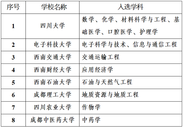 四川省有普通高校137所(含6所部属),其中8所高校14个学科进入国家第一轮和第二轮建设名单,入选高校及学科数分别在第一轮居全国第4位和第8位,在第二轮居第4位和第9位。按照国家“双一流”建设决策部署,我省结合实际创造性开展省属高校学科建设。在第一轮建设中,从全省25所研究生培养高校中遴选11所高校22个学科纳入四川省“双一流”建设名单;在第二轮建设中,按照Ⅰ、Ⅱ、Ⅲ类对建设学科进行布局,从全省52所本科高校中,遴选39所高校162个学科纳入建设名单。