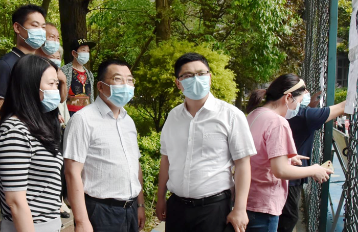 图为区人大常委会主任叶祥金在查看小区核酸检测点的安排情况