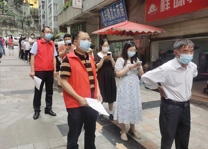 5月12日,区人大常委会机关派出志愿者,到三里坪街道店子梁社区核酸检测点协助核酸检测工作,帮助维持现场检测秩序,让“大白”能专心于采样工作。同时,机关志愿者还到小区、楼院开展动员工作,组织居民进行核酸检测。