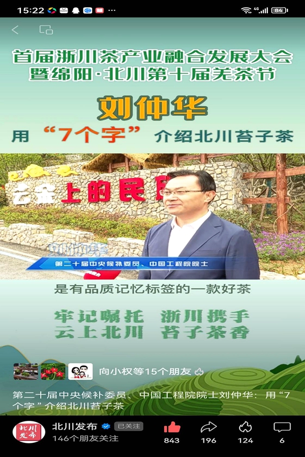 第二十届中央候补委员、中国工程院院士刘仲华点赞“北川苔子茶”。
