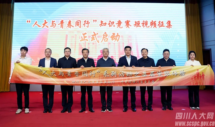 在欢快的音乐声中,王雁飞、罗强、贾瑞云,省委教育工委副书记、教育厅党组成员张澜涛,团省委书记唐经天,四川师范大学党委书记郭勇和全国人大代表唐利军,学生代表匡俊钢、刘可盈上台,共同启动集中开展“人大与青春同行”系列活动。