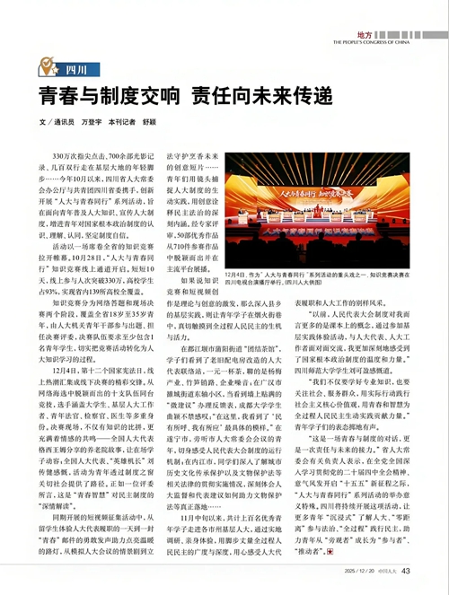 近日出版的2025年第24期《中国人大》杂志,刊发了省人大常委会办公厅开展“人大与青春同行”系列活动宣传稿件《四川:青春与制度交响 责任向未来传递》。