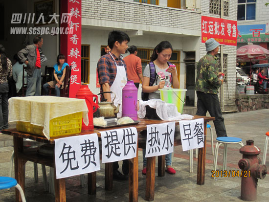 荥经县各级人大代表充分发挥模范带头作用,不等不靠,带头进行抗震自救。严道镇县乡人大代表组成人大代表志愿服务队,为受灾群众和过境支援者提供开水、食物,协助维护通往重灾区生命线荥天路的交通秩序。
