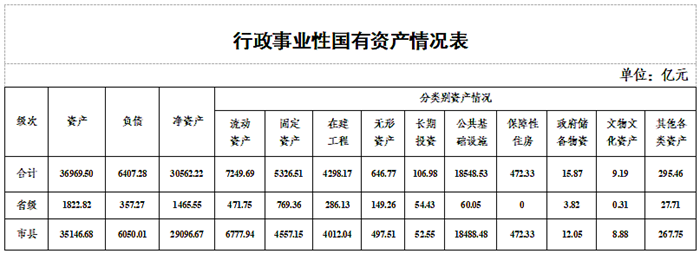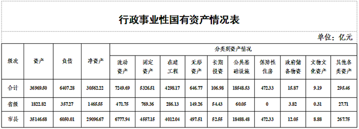 (三)行政事业性国有资产。资产总额3.7万亿元,增长3.55%;负债总额0.64万亿元,下降0.88%;净资产总额3.06万亿元,增长4.53%。其中,行政单位资产2.04万亿元,增长4.1%;事业单位资产1.66万亿元,增长2.47%。