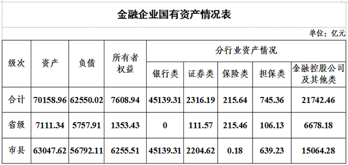 (二)金融企业国有资产。资产总额7.02万亿元,增长16.37%;负债总额6.26万亿元,增长17.23%;所有者权益总额7608.94亿元,增长9.76%,其中:国有金融资本权益总额5624.32亿元,增长10.87%。营业收入1643.97亿元,增长7.57%;利润总额589.88亿元,增长14.88%;净利润487.20亿元,增长15.16%;上交税费286.63亿元,增长12.72%。