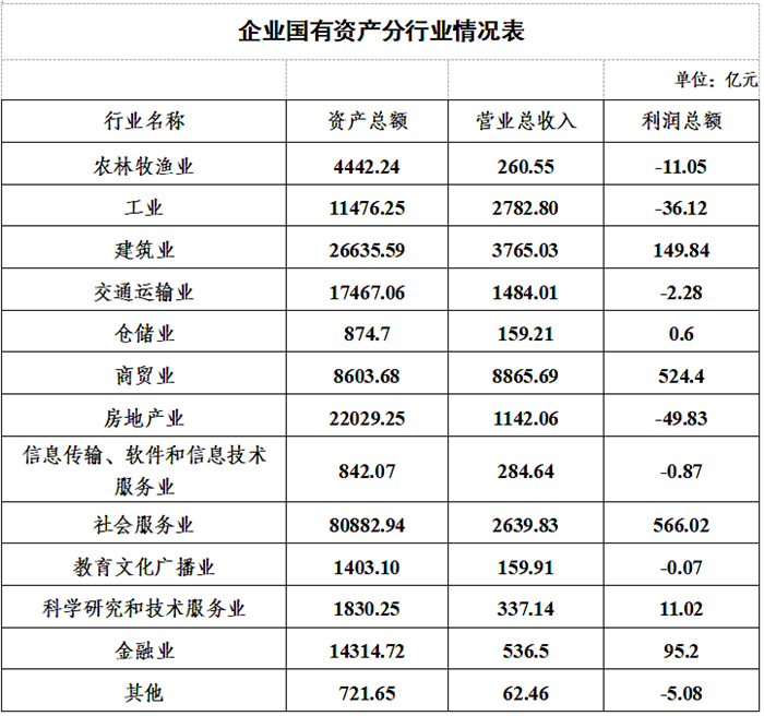 (一)企业国有资产。资产总额19.15万亿元,增长13.12%;负债总额12.44万亿元,增长13.16%;所有者权益总额6.71万亿元,增长13.05%。其中:国有资本权益总额5.77万亿元,增长10.7%;营业总收入2.25万亿元,增长7.42%;利润总额1241.78亿元,下降4.22%;净利润870亿元,下降6.75%;上交税费1440.85亿元,增长5.68%。分行业看,资产主要集中在社会服务业、建筑业、房地产行业以及交通运输业。
