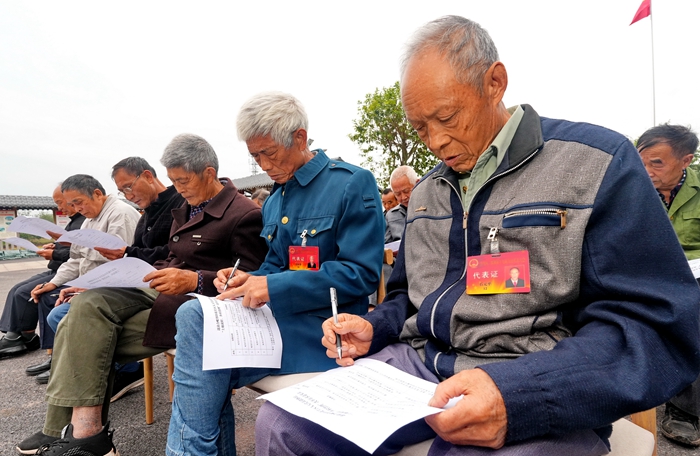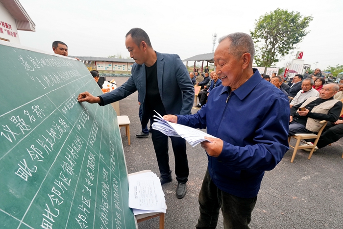 议事会现场,重庆市潼南区宝龙镇长新村村民唐安和其他村民认真查看征求意见表并勾画选项。他表示,此次票决他最关心的还是毗邻片区土地流转机制的建立。“建立土地流转机制后,几地产业抱团发展力度更大,也更利于种植技术的交流共享。”