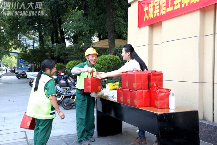 金秋送爽,丹桂飘香。在国庆、中秋双节即将来临之际,大成宾馆门前暖意融融,一盒盒寓意团圆的月饼整齐摆放。9月29日下午,大成宾馆工会驿站在此组织开展了一场温馨的慰问活动,省人大常委会副秘书长罗春梅率宾馆职工慰问常年默默奉献在机关周边的环卫工人、快递小哥、交通警察等一线户外工作者,送上精心准备的中秋月饼,传递节日的祝福与诚挚的感谢。
