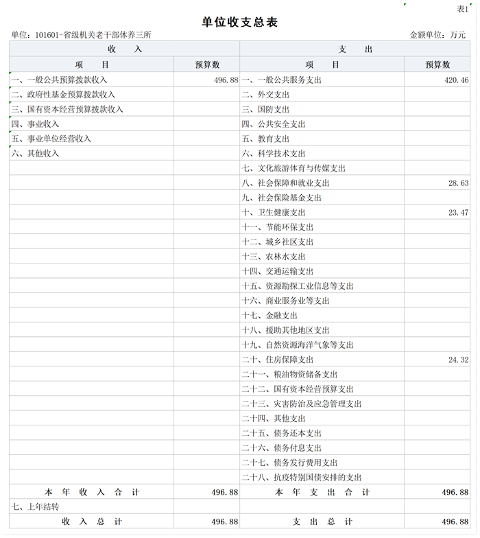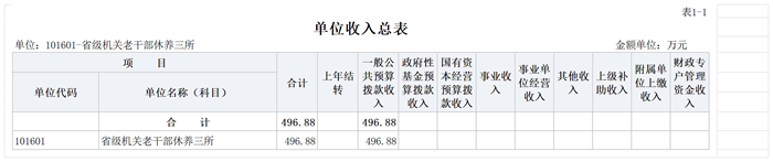 省级机关老干部休养三所2026年收入预算496.88万元,其中:一般公共预算拨款收入496.88万元,占100%。