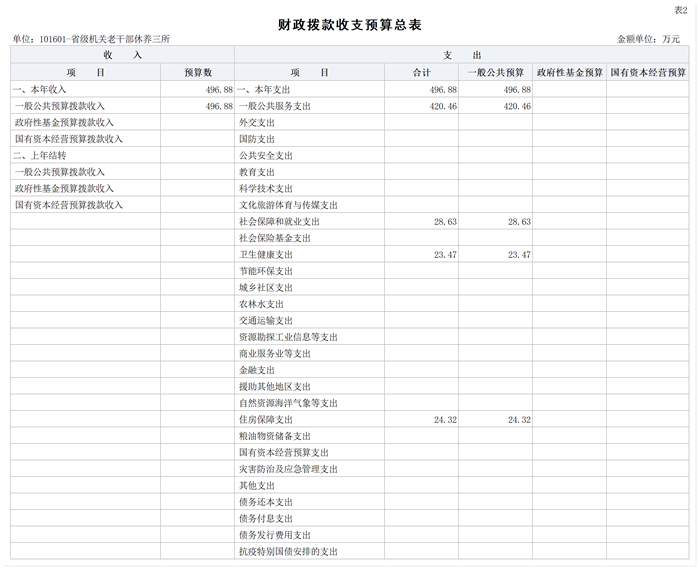 省级机关老干部休养三所2026年财政拨款收支预算总数496.88万元,比2025年财政拨款收支预算总数减少21.91万元,主要原因是项目经费减少。