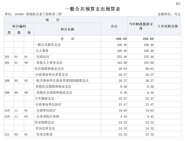 按照综合预算的原则,省级机关老干部休养三所所有收入和支出均纳入单位预算管理。收入包括:一般公共预算拨款收入;支出包括:一般公共服务支出、社会保障和就业支出、卫生健康支出、住房保障支出。省级机关老干部休养三所2026年收支预算总数496.88万元,比2025年收支预算总数减少21.91万元,主要原因是项目经费减少。