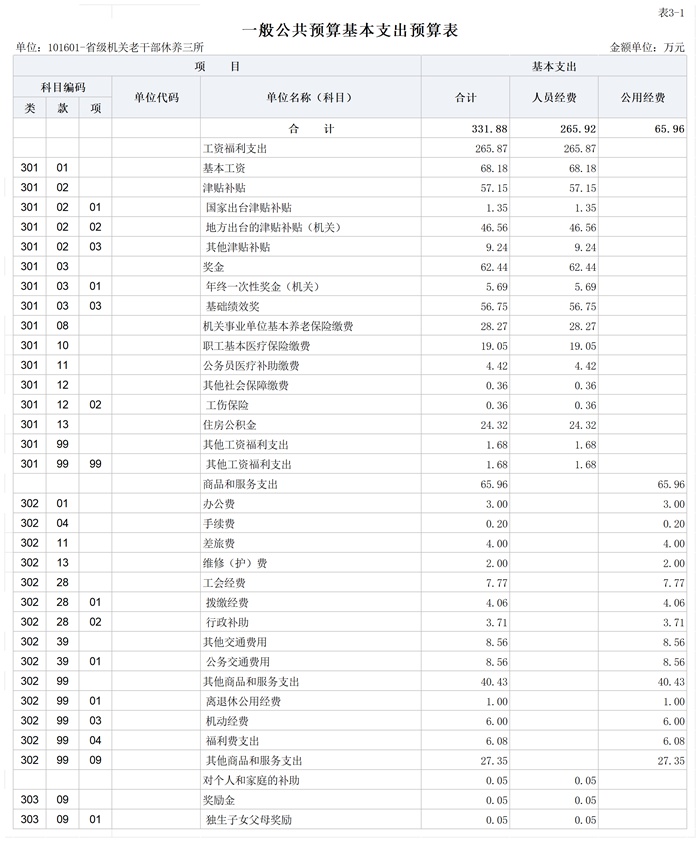 省级机关老干部休养三所2026年一般公共预算基本支出331.88万元,其中:
