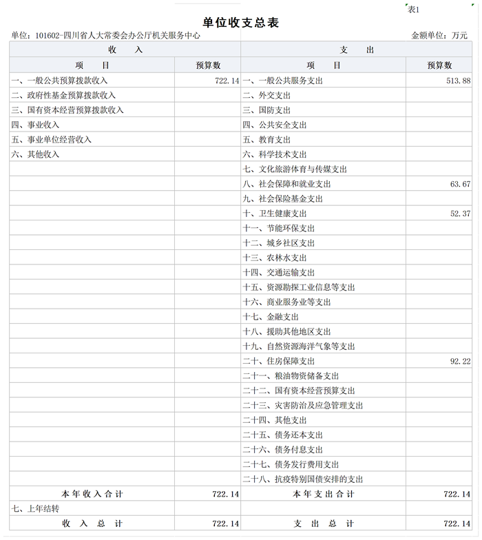 收入包括:本年一般公共预算拨款收入722.14万元;支出包括:一般公共服务支出513.88万元、社会保障和就业支出63.67万元、卫生健康支出52.37万元、住房保障支出92.22万元。