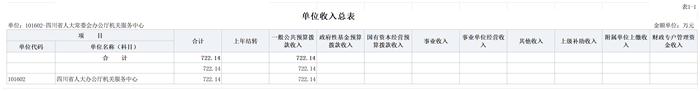 四川省人大常委会办公厅机关服务中心2026年收入预算722.14万元,其中:上年结转0万元,占0%;一般公共预算拨款收入722.14万元,占100%。