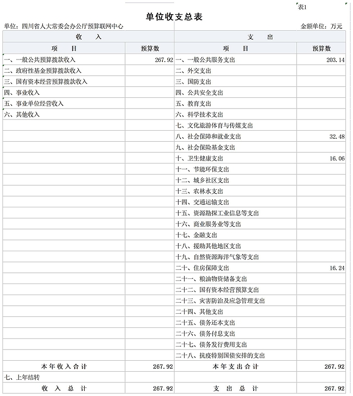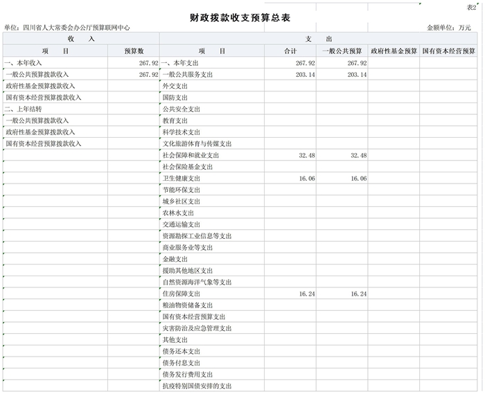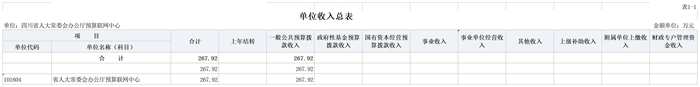 四川省人大常委会办公厅预算联网中心2026年收入预算267.92万元,其中:一般公共预算拨款收入267.92万元,占100%。