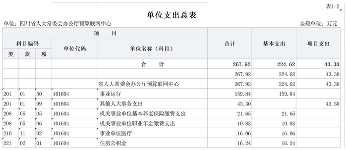 四川省人大常委会办公厅预算联网中心2026年支出预算267.92万元,其中:基本支出224.62万元,占83.84%;项目支出43.3万元,占16.16%。