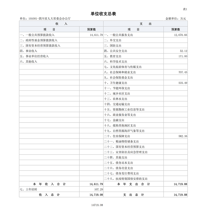 按照综合预算的原则,四川省人大常委会办公厅所有收入和支出均纳入单位预算管理。收入包括:一般公共预算拨款收入和上年结转;支出包括:一般公共服务支出、公共安全支出、教育支出、社会保障和就业支出、卫生健康支出、住房保障支出。四川省人大常委会办公厅2026年收支预算总数14719.08万元,比2025年收支预算总数减少1476.37万元,主要原因是2026年结转继续实施项目总体规模较2025年减少。