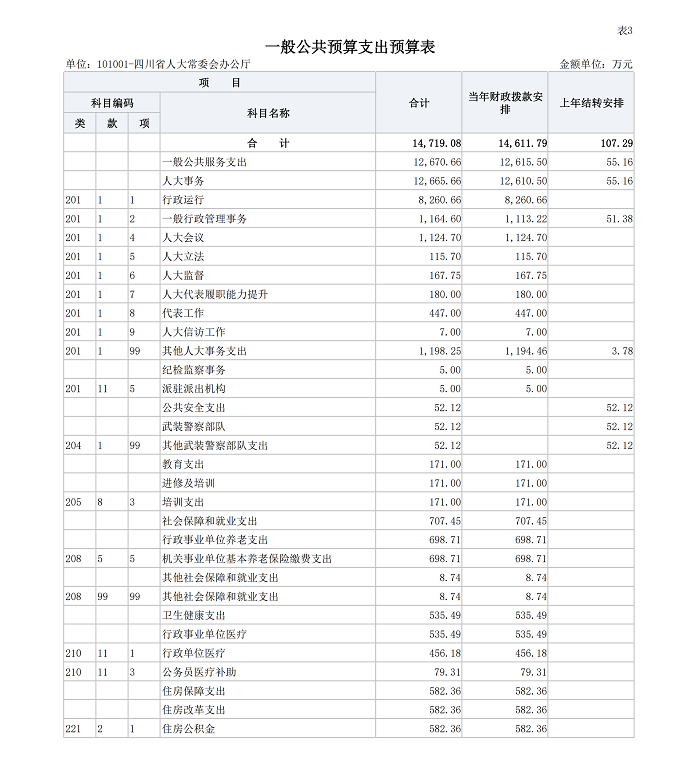 四川省人大常委会办公厅2026年支出预算14719.08万元,其中:基本支出11381.66万元,占77.33%;项目支出3337.42万元,占22.67%。