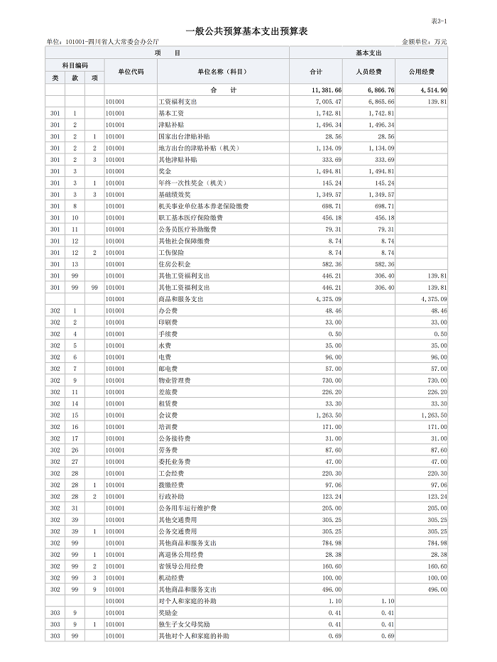 四川省人大常委会办公厅2026年一般公共预算基本支出11381.66万元,其中: