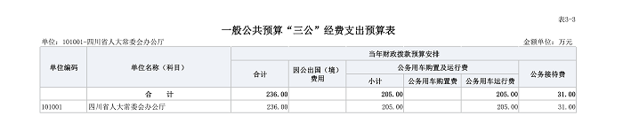 四川省人大常委会办公厅2026年“三公”经费财政拨款预算数236万元,其中:公务接待费31万元,公务用车购置及运行维护费205万元,因公出国(境)经费0万元。