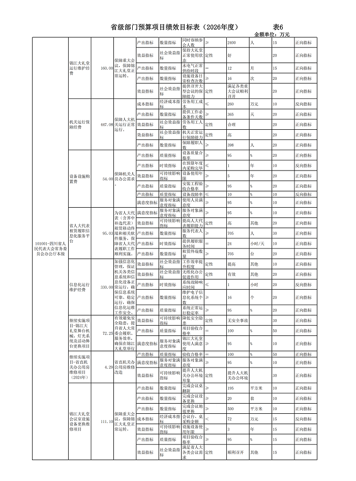 2026年四川省人大常委会办公厅开展绩效目标管理的项目49个,涉及预算14719.08万元。其中:人员类项目7个,涉及预算6866.76万元;运转类项目26个,涉及预算6679.75万元;特定目标类项目16个,涉及预算1172.57万元。